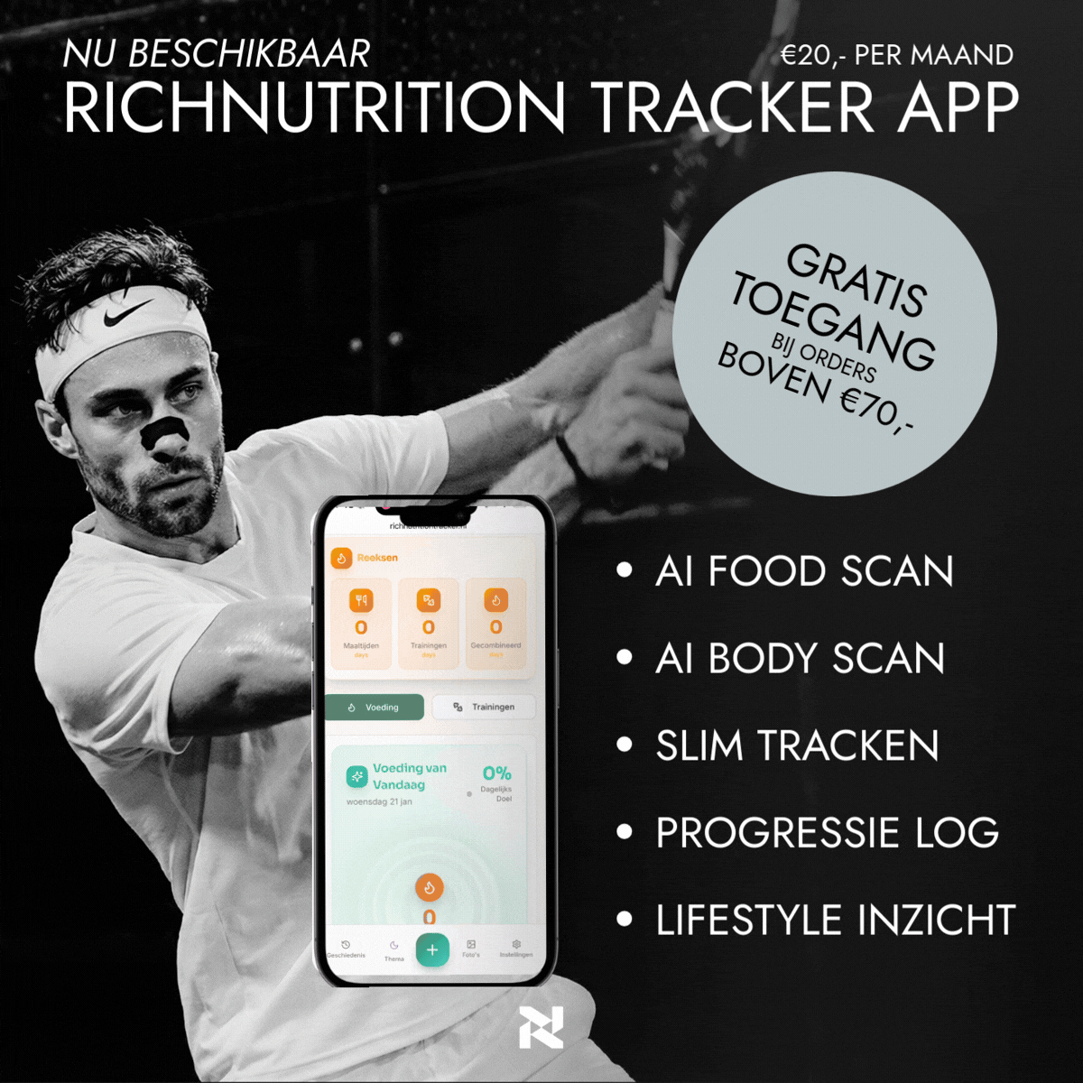 Als je de grens van €70 bereikt, geven wij je geven de sleutel tot succes. Met de RichNutritiontracker scan je maaltijden via AI en meet je je vetpercentage met één foto. Geen gedoe meer: track je progressie, workouts en lifestyle op één plek.